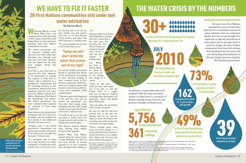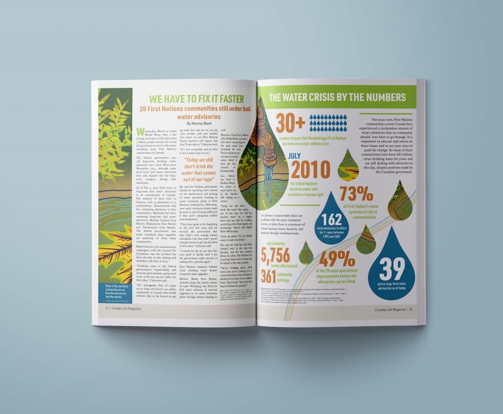 This editorial spread shines light on the water crisis that Indigenous communities across Canada are facing. On the right side of the spread is the article on the water crisis, and on the left side of the spread is an infographic that put the water crisis into numbers. The main objective of this design was to create an overall engaging editorial spread that was bold and interesting to look at, while also staying professional and respectful of the subject matter at hand. This was achieved by sticking to a limited but bold colour palette, as well as utilizing a bold sans-serif typeface for headings rather than something leaning too into the decorative side.